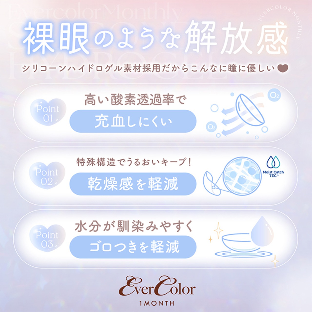 エバーカラーマンスリーはシリコーンハイドロゲル素材採用で裸眼のような解放感!