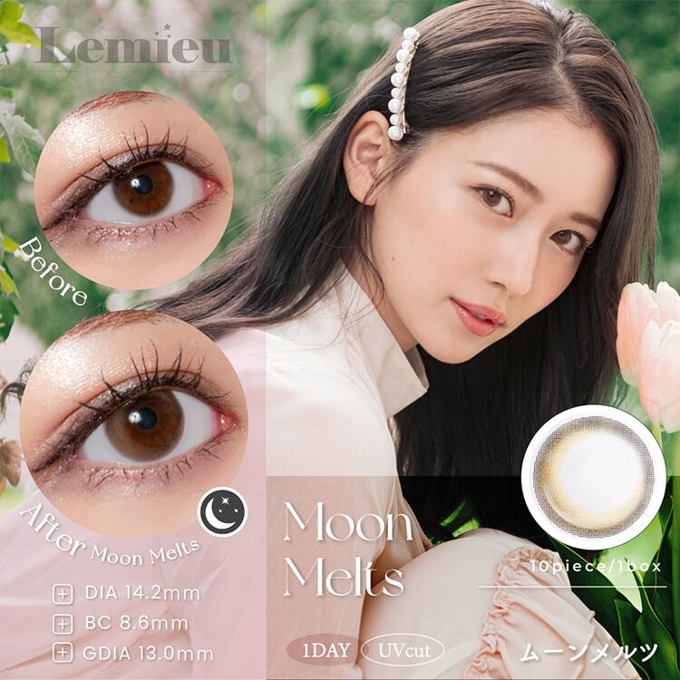 カラコン カラーコンタクト 1日 1DAY 1箱10枚入り 度あり 度なし UVカットあり フチあり ナチュラル デート アラサー ちゅるん あか抜け くっきり ツヤ感 甘め 色素薄い系 ブラウン ベージュ トーンアップ 月模様 特殊柄 月デザイン 三日月 三日月柄 三日月デザイン 水光感 水光 流行 トレンド